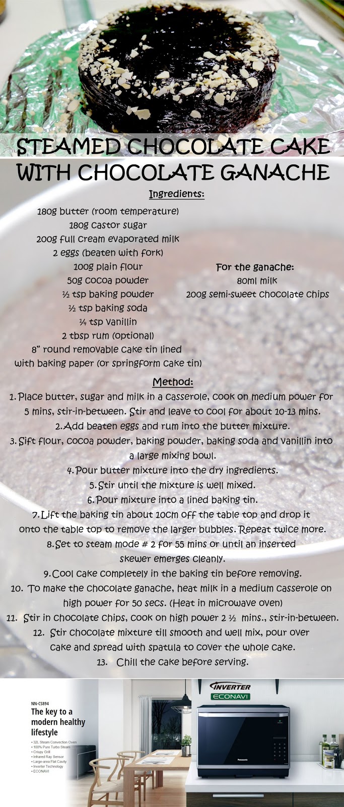 Next, was Steamed Chocolate Cake with Chocolate Ganache, a recipe inspired by blogger Diana Gale from DomesticGoddessWannabe. With my outdated brain, I figured, use a steamer to steam lah right? One of Panasonic's microwave can also steam lah... Horray for less appliance to deal with! There's a compartment drawer underneath where you can store water that could last for 30 minutes.